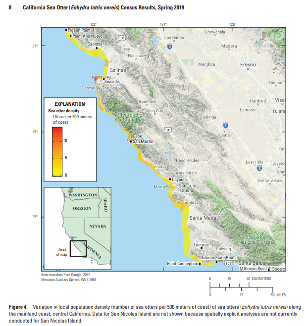 The most recent sea otter population survey found the most sea otters between Seaside and Cayucos, with the area of greatest population density in the Monterey Peninsula.